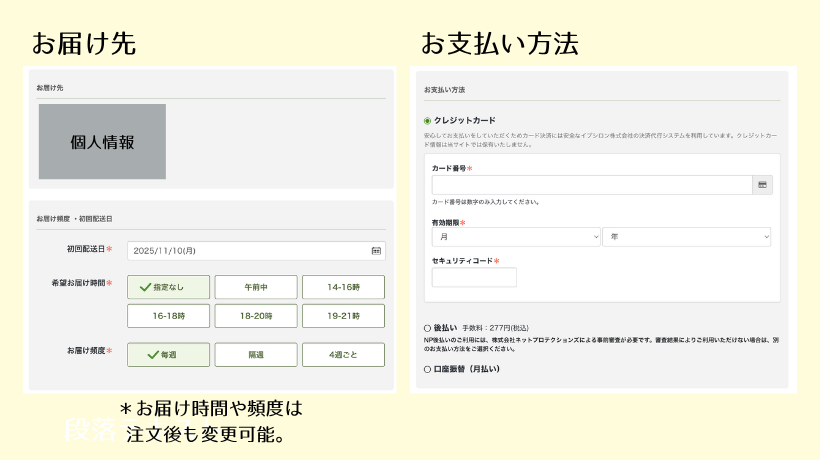 お届け先:宅配して欲しい住所の入力と時間帯や頻度を選択。