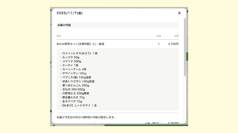 また坂の途中の定期便は送られる予定の野菜をマイページで確認できます。
