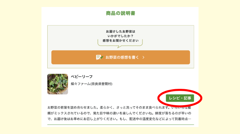 マイページでは野菜ごとにレシピが載っているので、使い方がわからない食材があっても安心です。