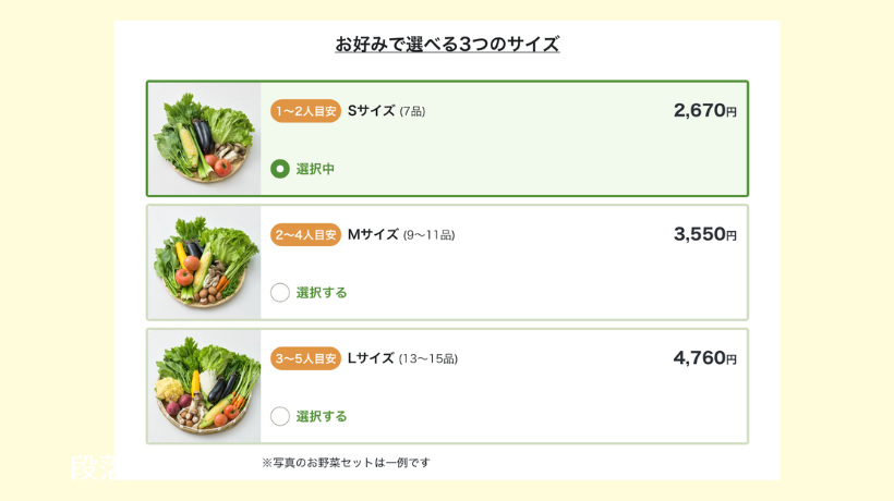 無理なくサービスが使えるように、受け取りの頻度は「毎週お届け / 隔週お届け / 4週ごとお届け」の3種類があります。