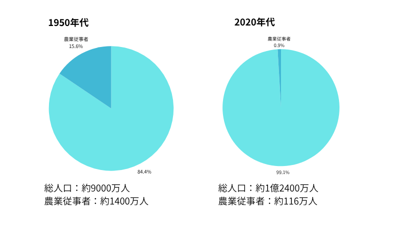 また直近(2023~2025年)の農業従事者の人口は約116万人で、ピークだった1950年代の約1400万人からすると約1/12にまで減っているそうです。