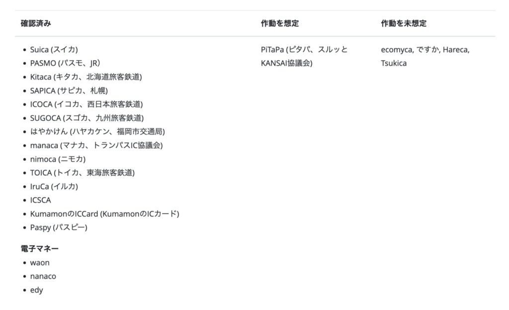 SuikaやPASMOなどの代表的な交通系ICカードだけでなく、西日本のICOKAや九州のSUGOKAなど約12種類の交通系ICカードに対応しています。(2025年現在)
