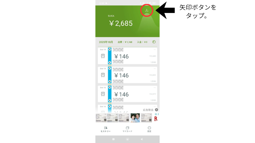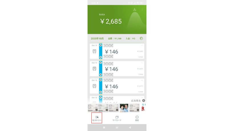アプリ機能:スマホに交通系ICカードをかざすことで使用履歴や残高をチェックできる。
