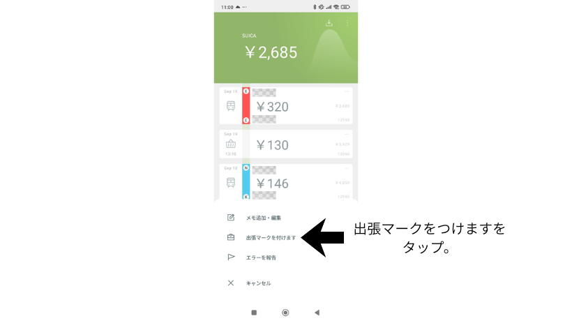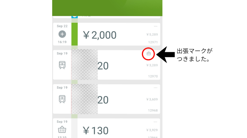 会社に申請する分の交通費だけ出張マークをつけておけば、この後紹介する絞り込み機能を併用することでプライベートで使用した費用と分けて見ることができます。