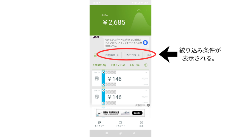 画面左側のヒストリーをタップすると今までの使用履歴がチェックできます。