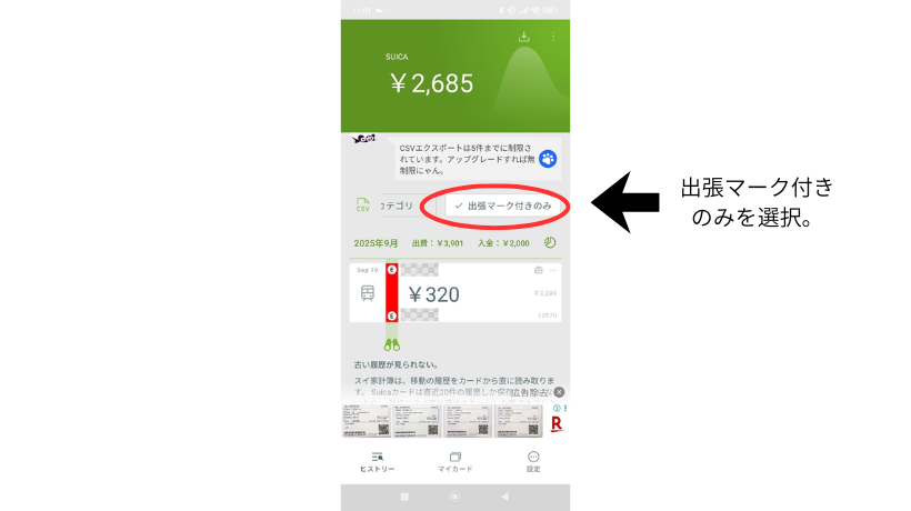 もし営業の仕事をしていて電車での移動が基本であれば、出張マークをつけた履歴だけCSVでExcelに落とし込むことができるので経費申請がさらに楽にできます。※有料のプレミニャンプランのみ対応。