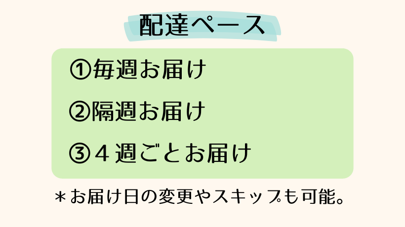 無理なくサービスが使えるように、受け取りの頻度は「毎週お届け / 隔週お届け / 4週ごとお届け」の3種類があります。